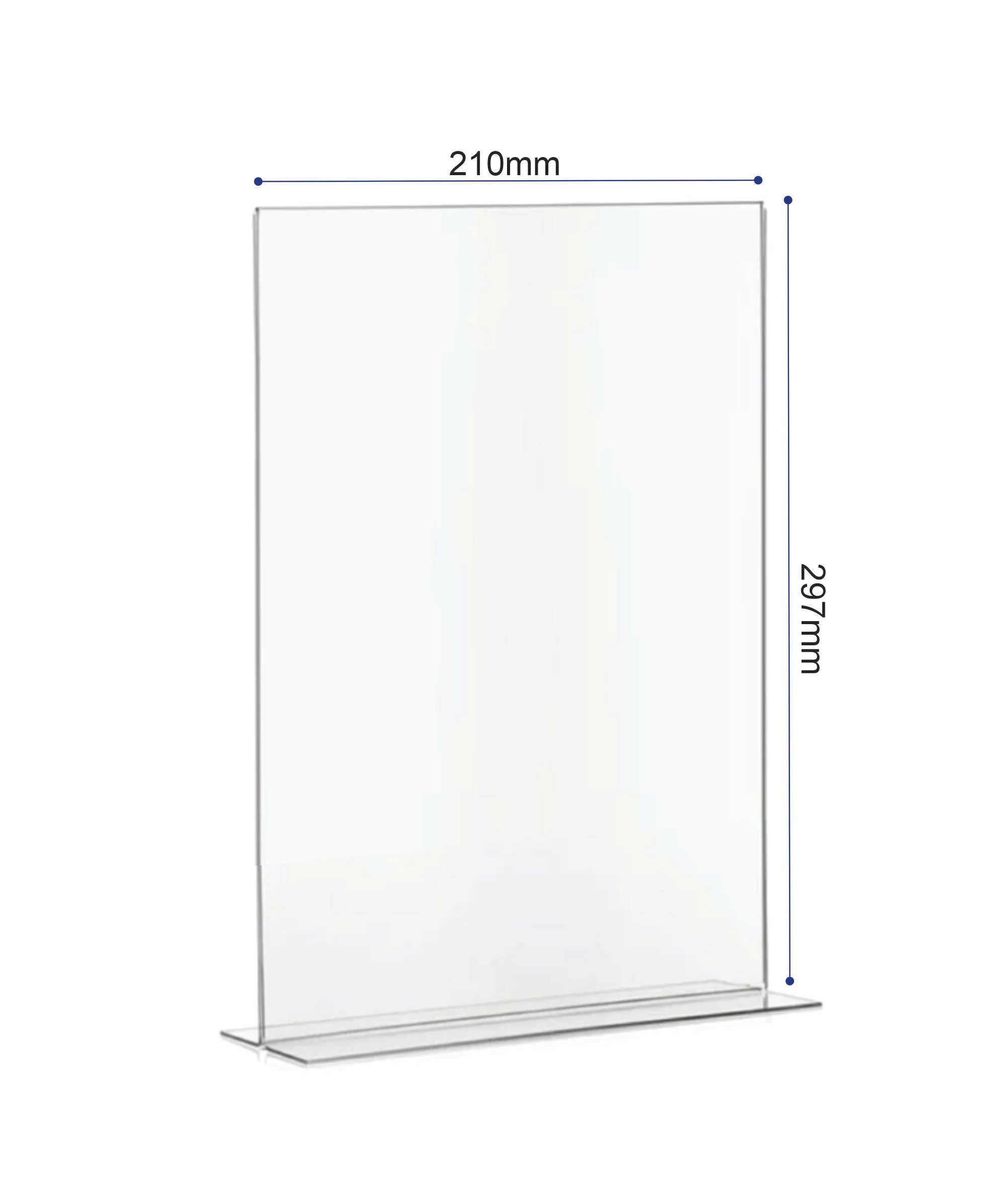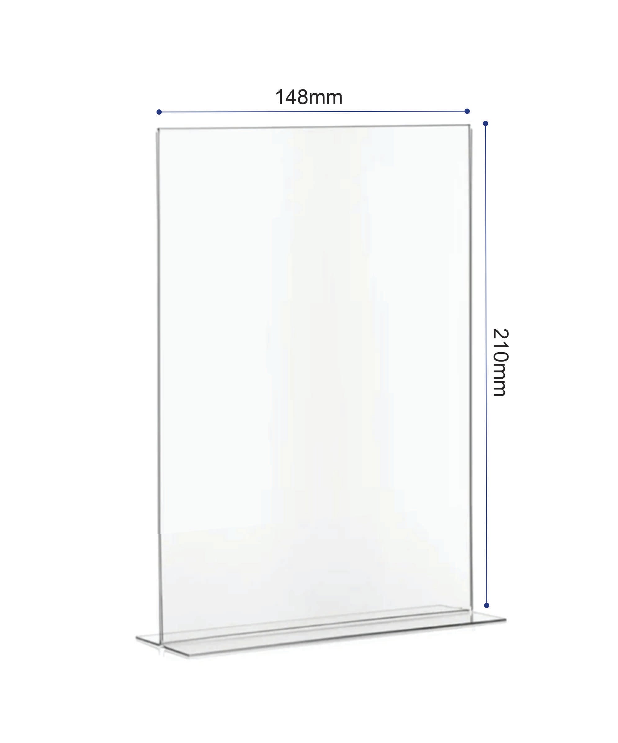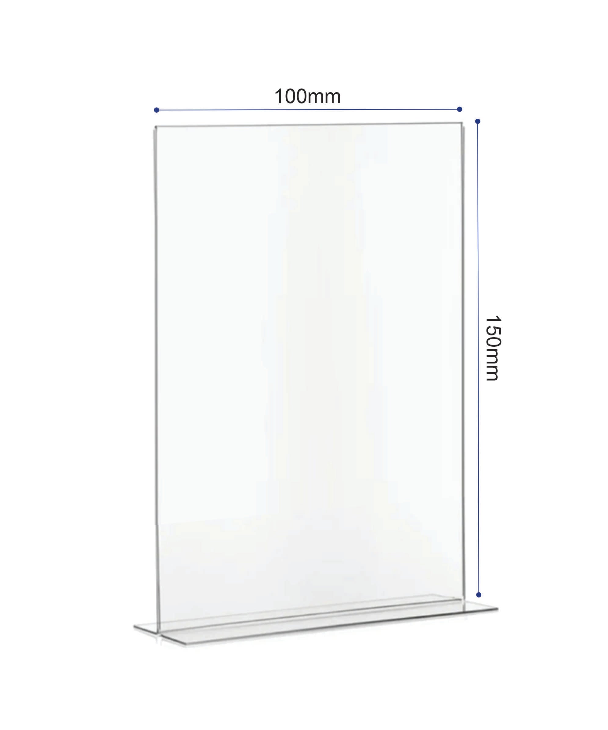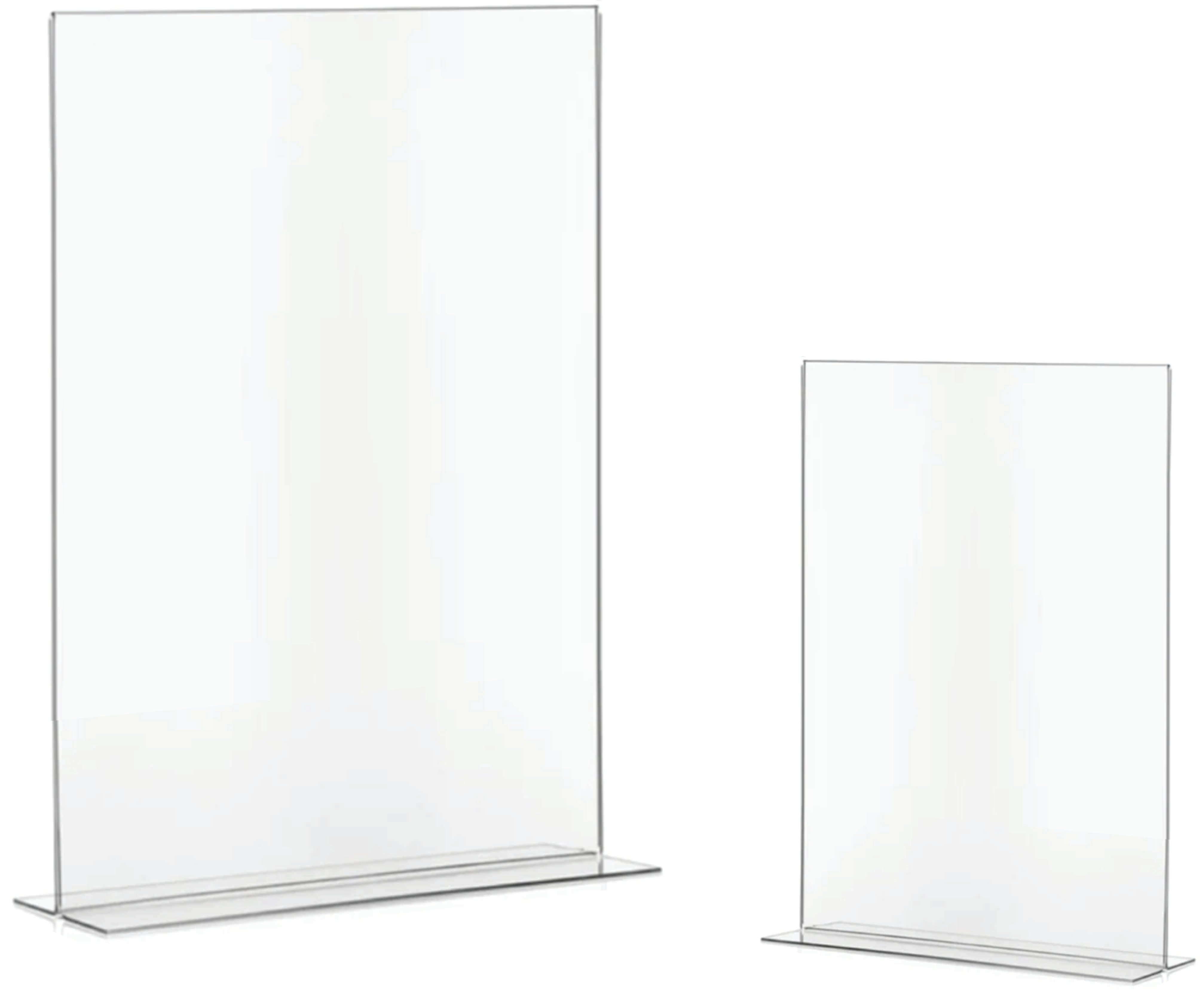 An acrylic T‑base double‑sided sign holder is a clear display stand designed with a flat “T” shaped base and two upright panels back‑to‑back. It allows inserts to be viewed from both sides, making it ideal for restaurants, retail counters, offices, and events.