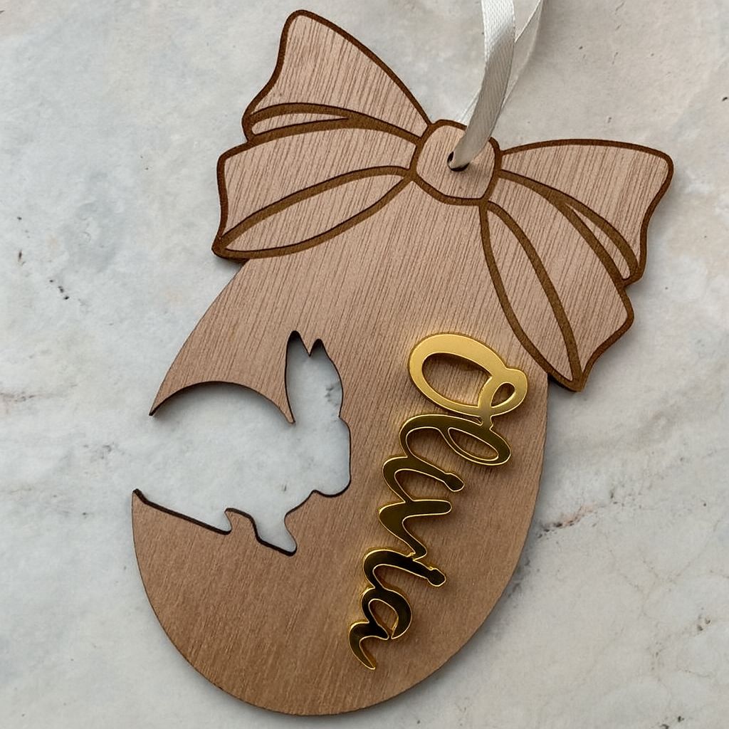 Add a touch of whimsy to your Easter gifts with our Egg & Bow Easter Tag with Raised Acrylic Letters. Each tag combines a laser-cut egg base, a charming bow, and beautifully layered acrylic letters for a bespoke, dimensional look.