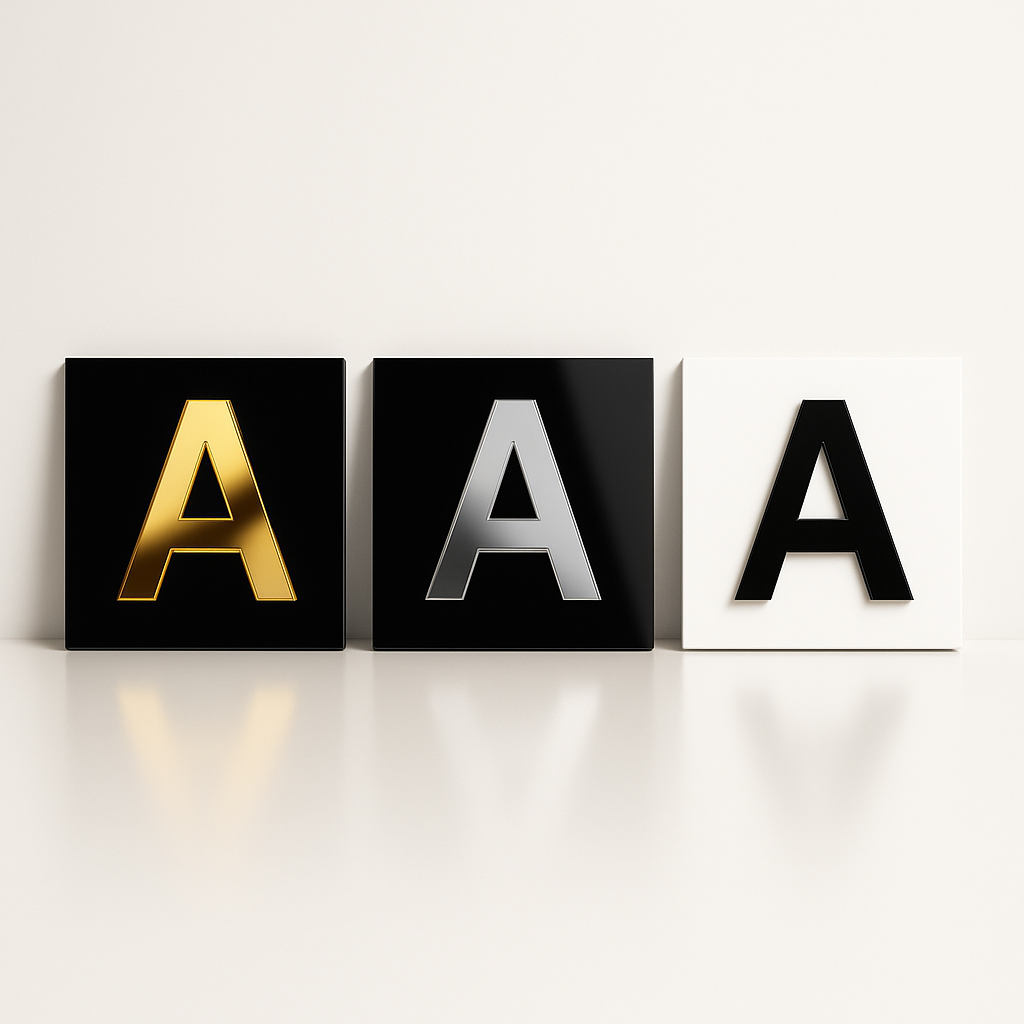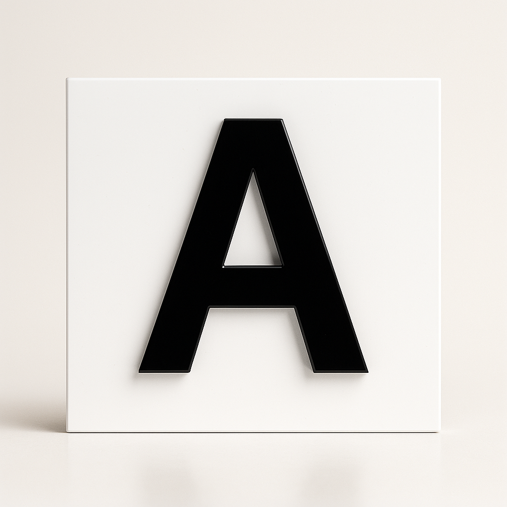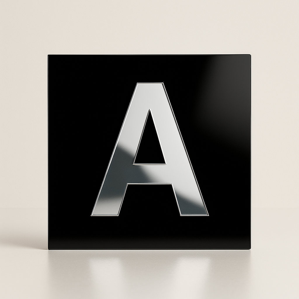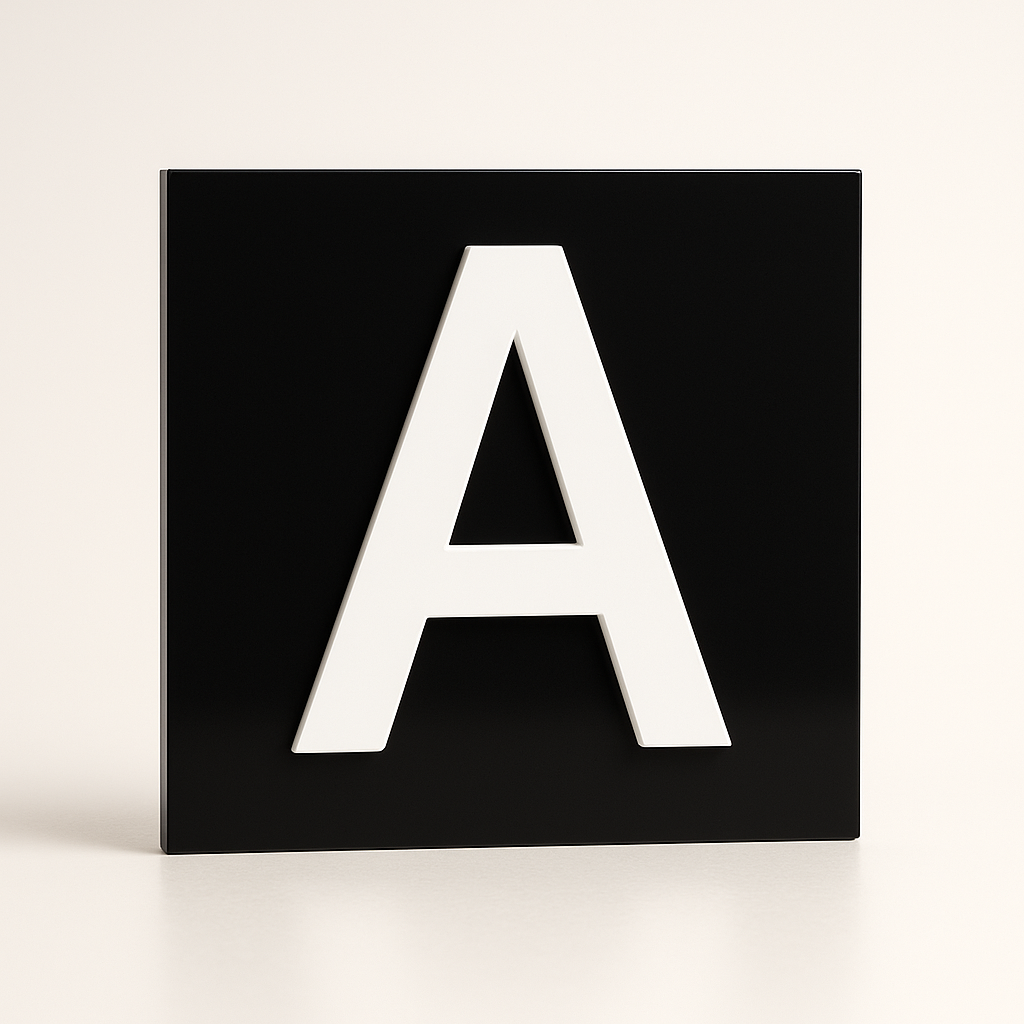 Tip: For maximum readability, choose Black tile with White or Mirror Gold/Silver, or White tile with Black or Mirror Gold/Silver. Same-colour pairings (e.g., White on White or Black on Black) create a subtle 3D effect with low contrast.