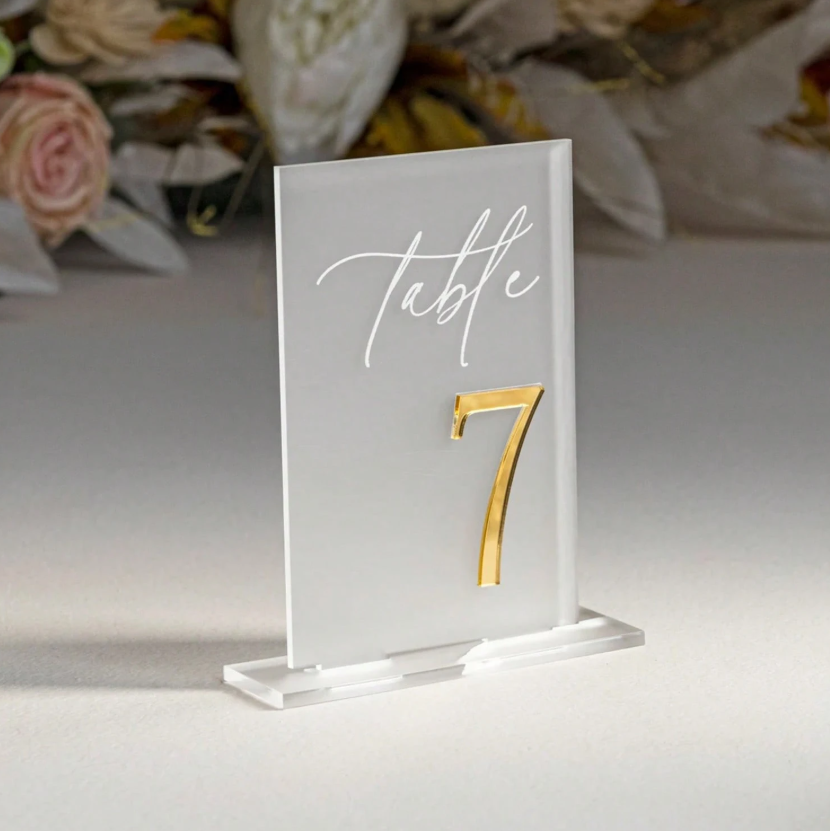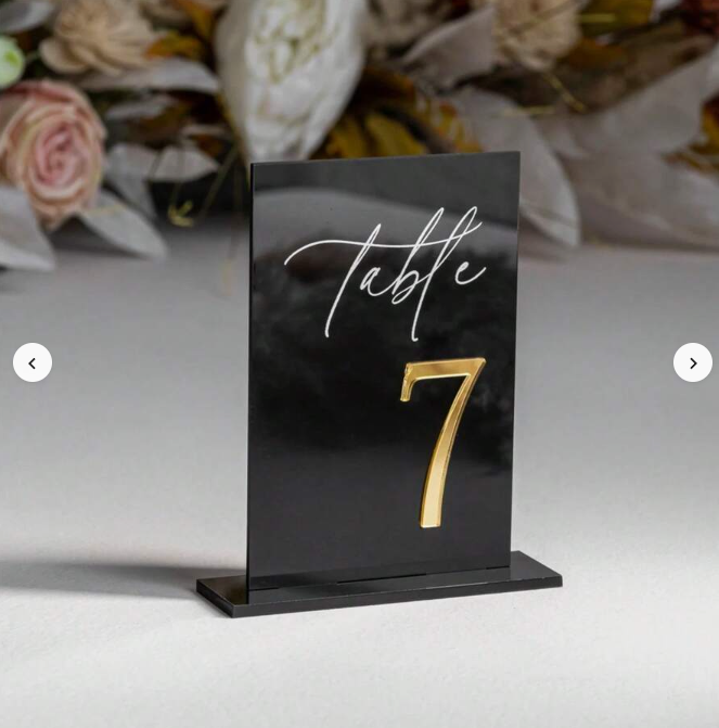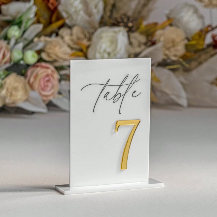 Elegant, modern and versatile β these acrylic wedding table numbers add a sophisticated touch to your event dΓ©cor. Featuring raised 3D numbers in metallic finishes and silk-style lettering, they are designed to impress.