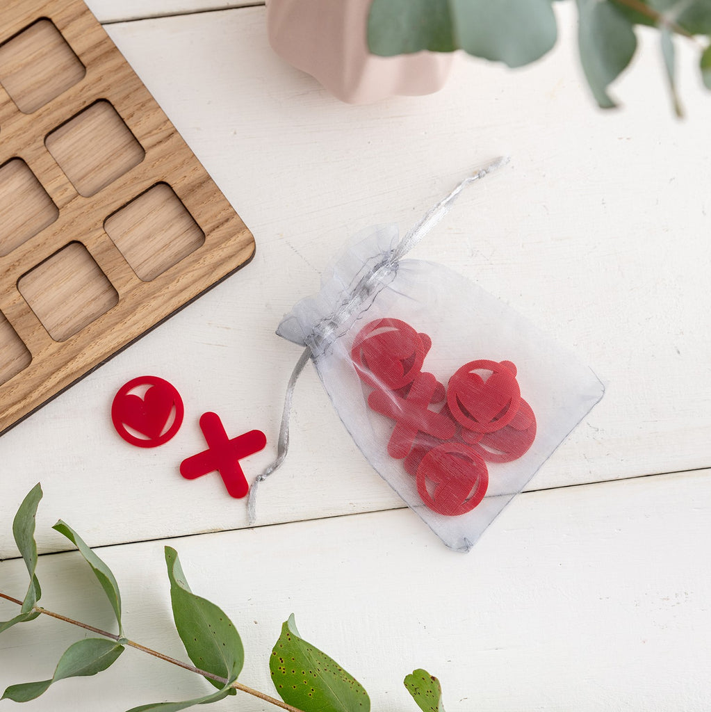 This fun game is large enough to be left out on the table, the red acrylic 'heart's & kisses' counters can be kept safe within the supplied organza bag.