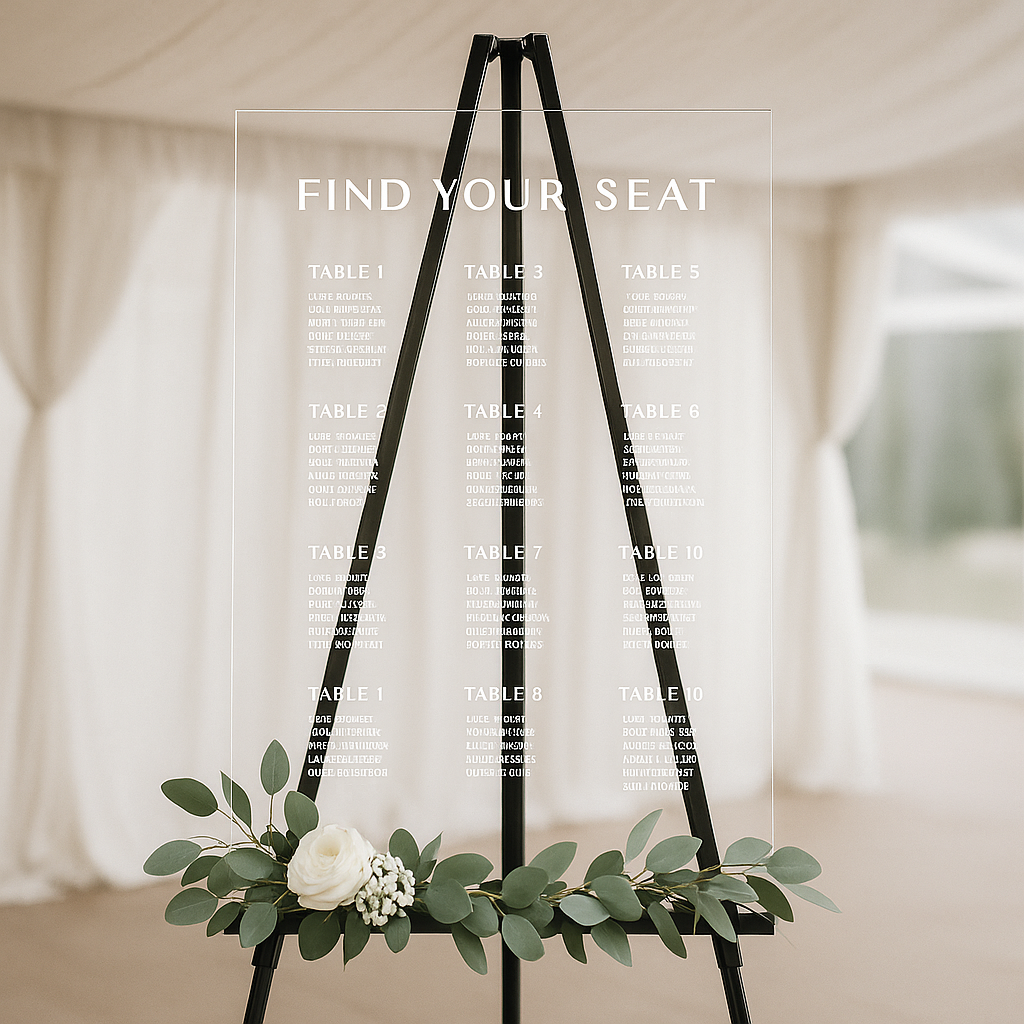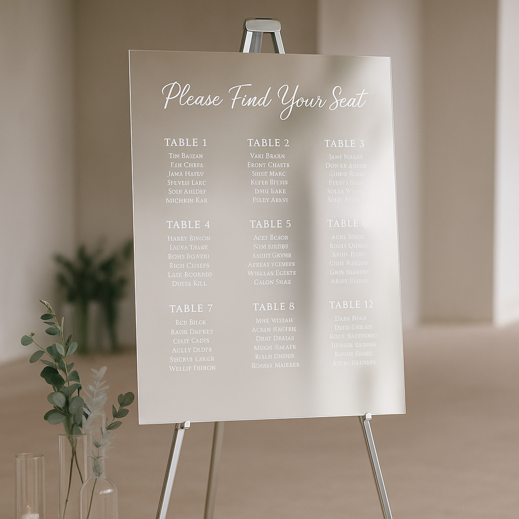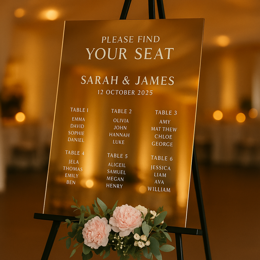 Guide your guests with elegance using our luxury seating charts, crafted in premium acrylic, mirror acrylic, or 6 mm Walnut/Oak wood. UV printed or engraved to suit the finish.