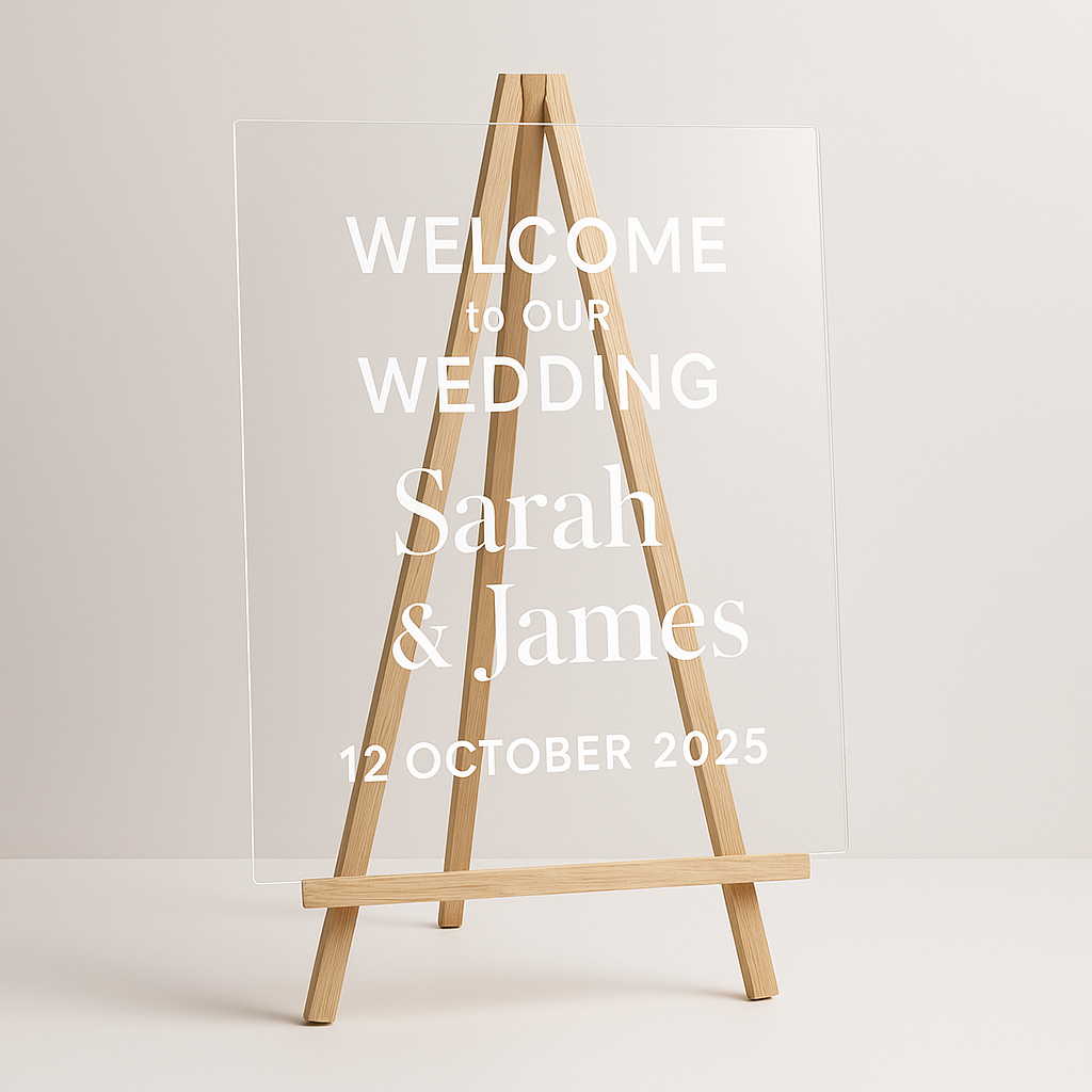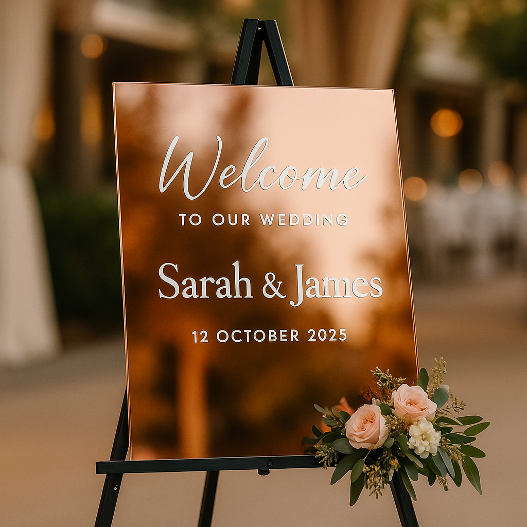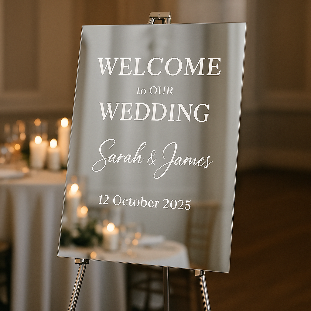 Set the tone for your special day with a luxury welcome sign crafted in premium materials to leave a lasting impression. Choose from sleek acrylic, reflective mirror, or timeless wood - each personalised to match your wedding style.